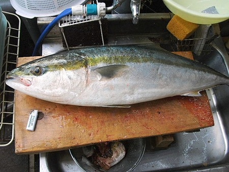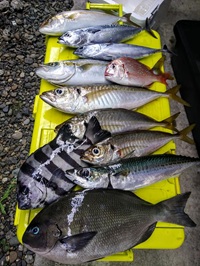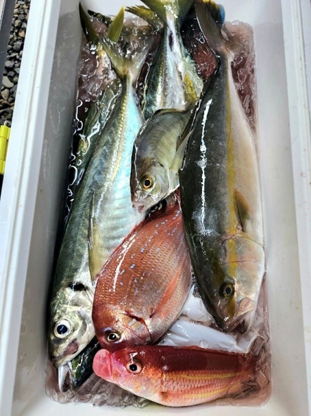 鯵にイナダ、真鯛、イトヨリなどいろいろ釣れました。最後に港前で小さい鯵を餌に「泳がせ釣り」では大きなワラサが釣れました。